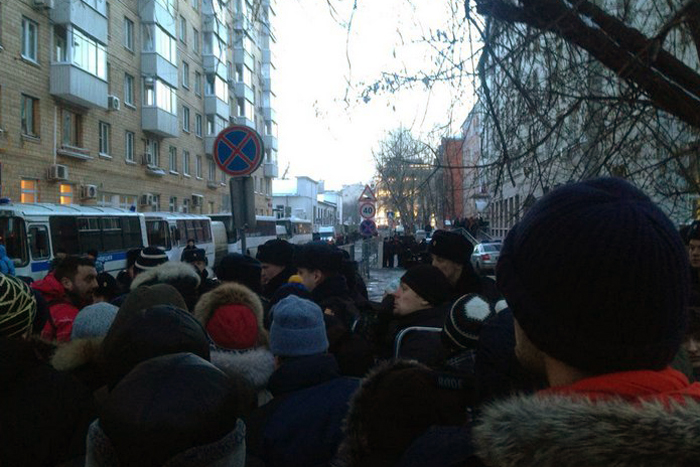 За час до начала оглашения приговора братьям Навальным полицейские начали выстраиваться у здания Замоскворецкого суда. Вдоль Татарской улицы уже стояли припаркованные полицейские грузовики, рядом толпились омоновцы и обычные полицейские в валенках и теплых куртках.