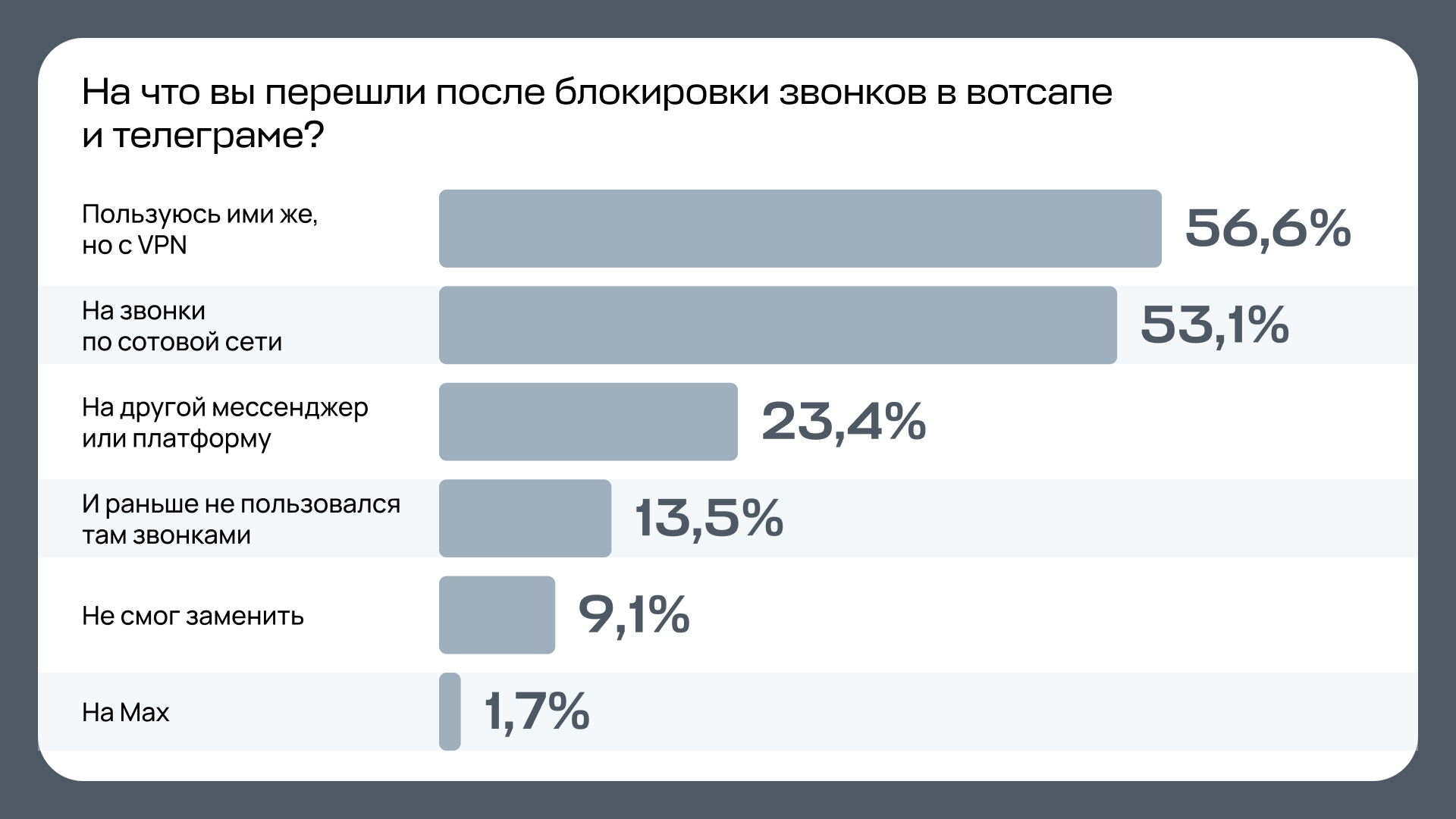 Большинству опрошенных после блокировок оказалось проще установить VPN, чем переходить в новые приложения. Так, 56,5 % опрошенных продолжают звонить в вотсапе и телеграме, но теперь делают это с включенным VPN. 53,2 % — звонят по сотовой сети, 23,4 % — перешли в другие мессенджеры.