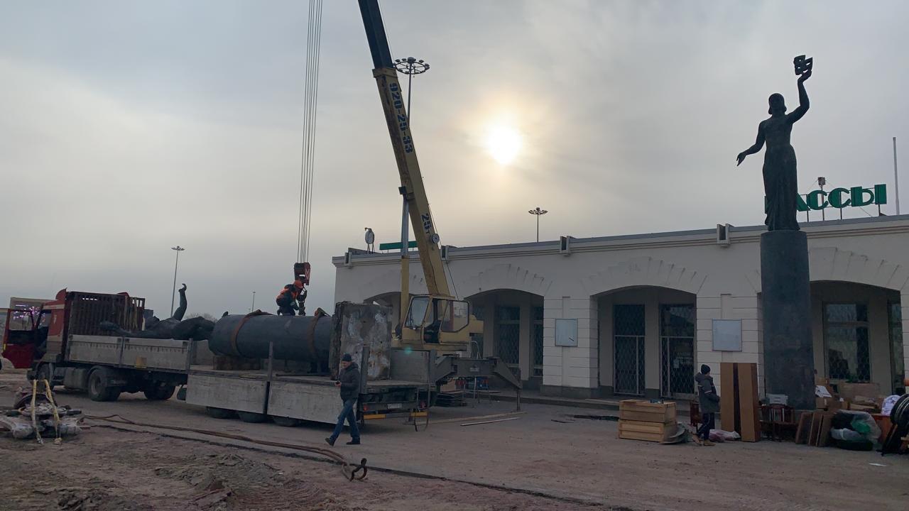 Скульптурную композицию из двух статуй, которые символизируют спорт и искусство, сняли при помощи автокрана, упаковали и перевезли на «Газпром Арену». Они были установлены у здания в 1981 году. После обрушения СКК в конце января 2020 года активисты требовали сохранить статуи.